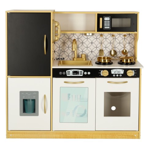 Drewniana kuchnia marki LULILO to wspaniała zabawka edukacyjna, która zaprasza dzieci do świata kulinarnych eksperymentów i pozwala rozwijać kreatywność oraz umiejętności manualne. Dzięki swojej przemyślanej konstrukcji i eleganckiemu wyglądowi, kuchnia przyciąga uwagę i inspiruje do twórczej zabawy. Wykonana z trwałego drewna, łączy klasyczny styl z nowoczesnymi detalami, a jej biało-czarna kolorystyka ze złotymi akcentami stanowi dodatek pokoju dziecięcego.