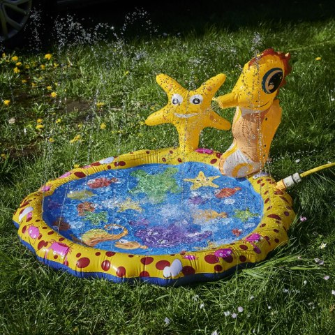 Design maty wodnej z pewnością przykuje uwagę Twojego malucha - żółty, rzucający się w oczy kolor, urocza grafika z morskimi zwierzętami i dwie figury w kształcie konika morskiego i rozgwiazdy nie pozwolą żadnemu dziecku przejść obok nich obojętnie!