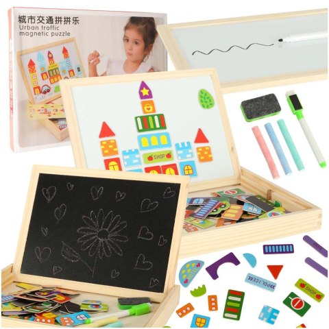 Drewniana tablica dwustronna z magnetycznymi puzzlami do układania obrazków.