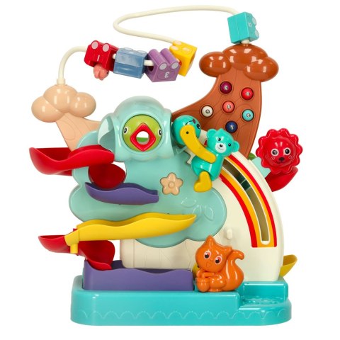 Zabawka posiada nie jeden, ale aż dwa tory, po których mogą toczyć się kolorowe kulki lub samochodzik. Dodatkową atrakcją są kolorowe wagoniki z cyframi, które dziecko może przesuwać i obracać. Ma również grę „nakarm ptaszka", która polega na zebraniu robaczków i nakarmienie nimi ptaka.