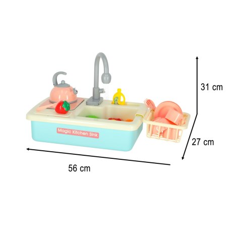 Zabawkowy zlew działa niemal jak prawdziwy - po włożeniu dwóch baterii AA pompa uruchamia obieg wody, dzięki czemu dziecko może myć naczynia i cieszyć się realistycznym doświadczeniem.